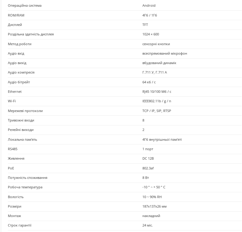 7 “IP відеодомофон. Сенсорний LCD екран з роздільною здатністю 1024×600. Тривога: 8вх / 2вих; Мережа: RJ 45 (100М), Wi-Fi 802.11b / g / n; Вбудована пам’ять 4 Гб, ОЗУ 1 ГБ; Новий GUI інтерфейс; Підтримка захоплення фото під час відеозв’язку. Віддалене відкриття дверей; Живлення DC 12В / PoE (802.3af). 187х137х26 мм
